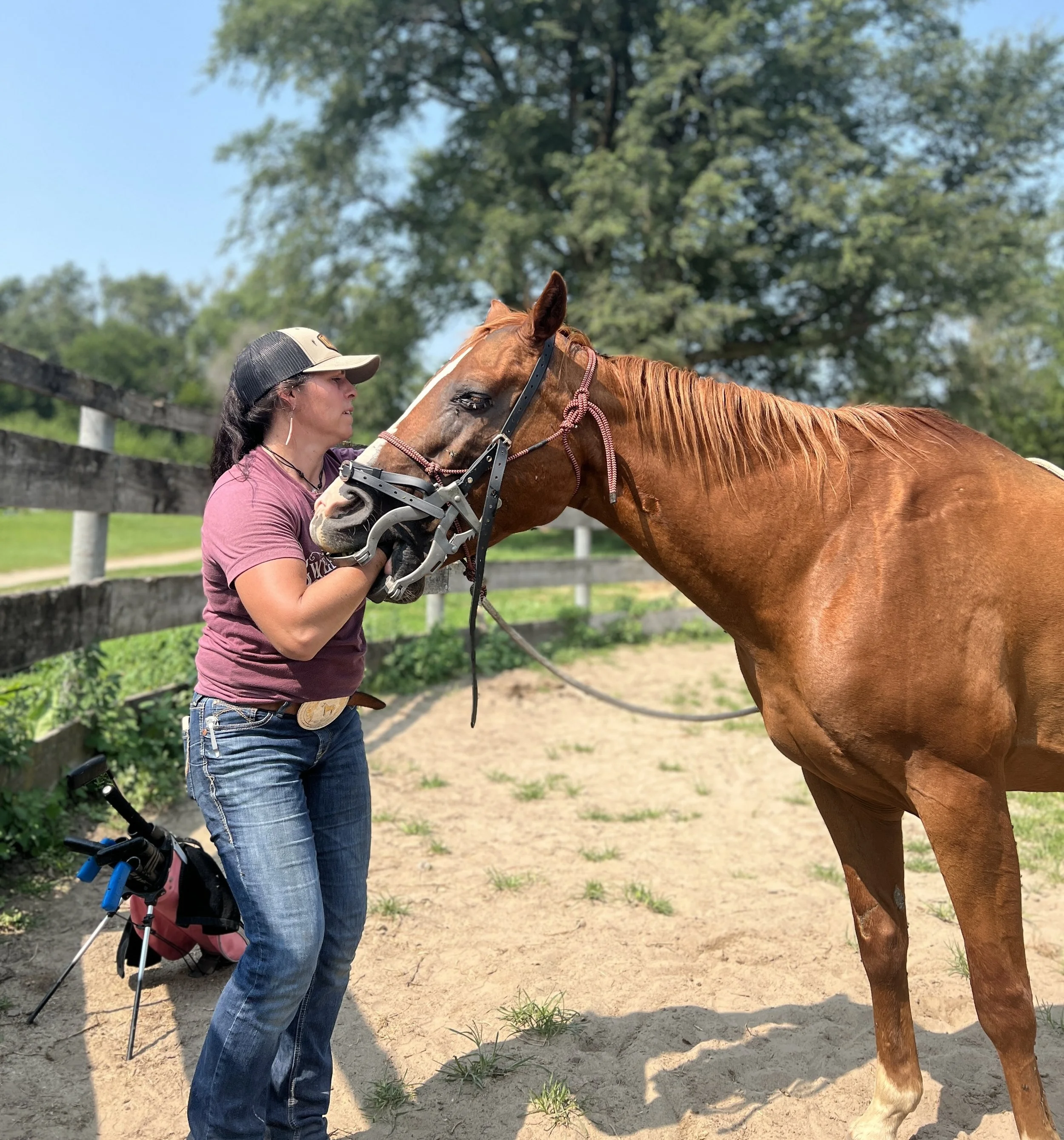 The method I was trained in focuses on overall balance, including the incisors, and restoring anatomical alignment of the jaw, anterior/posterior motion and lateral translation. I use only hand instruments, making it possible to do very precise adjustments to the tooth surface. This method also allows me to work with the horse in a more anatomically correct position and without the need for equipment to hang the head and excess sedation as a result of having to restrain a fearful horse.
